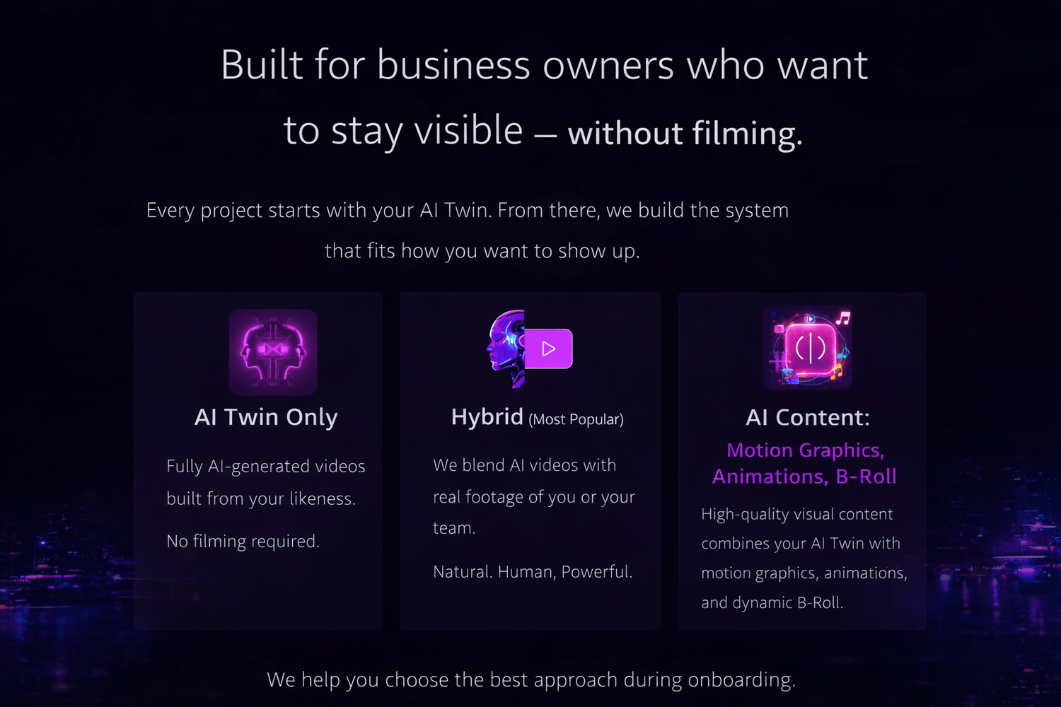 Our proven framework powers everything — AI Twins, real footage, or a combination of both.